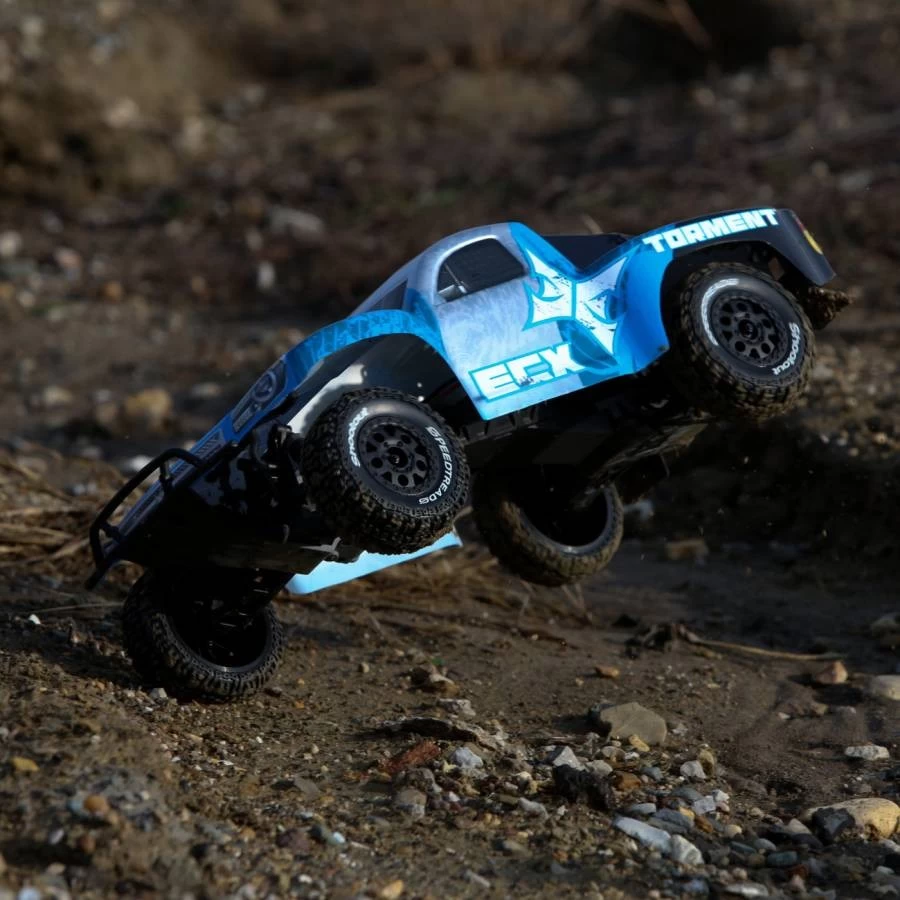 The ECX® Torment™ Short Course Truck is among the best handling, most durable, beginner-friendly RC vehicles on the market. Packed with features including Dynamite waterproof electronics and a nylon composite chassis construction, the Torment was built to withstand abuse as well as dish it out. To withstand the harsh conditions, the Torment utilizes heavy-duty driveshafts, designed to transfer power from the slipper clutch-equipped transmission to Dynamite SpeedTreads™ tires providing optimal grip in wet and dry conditions. A 15T Dynamite® motor and waterproof LiPo compatible 15T Tazer ESC gives the Torment an impressive increase in both acceleration and top speed. To complement its potent power system, the Torment includes a Spektrum 2.4Ghz transmitter and waterproof Spektrum SR201 receiver providing extended range and interference free operation. The Torment comes with your choice of two distinctive trim schemes, each of which make the Torment easy to recognize and hard to forget. The Torment SCT is fully ready-to-run, complete with everything it needs to take to the pavement, including the AAs. All the Torment needs is a full charge from the included charger on the included 6-cell Ni-MH battery, and it’s ready to deliver excitement. |