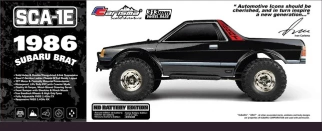 Carisma Scale Adventure is proud to offer this 313mm Wheelbase SCA-1E version of the iconic 1986 Subaru Brat, or ‘Bi-drive Recreational All-terrain Transporter’ to give it its full title! Its engrained in both automotive and R/C history with its immediately recognizable flowing lines and “ahead of its time” styling.
