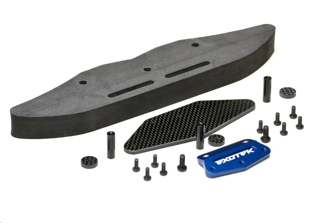 This is an Exotek Traxxas Slash Aluminum Drag Front Bumper Set, a heavy-duty bumper set made of aluminum alloy, carbon fiber and dense foam. This pack includes a heavy duty alloy and carbon fiber mounting base that secures the extra wide high density foam bumper, the same high impact foam used in touring car racing. Inside the foam bumper are 3 alloy posts for extra secure foam bumper mounting.