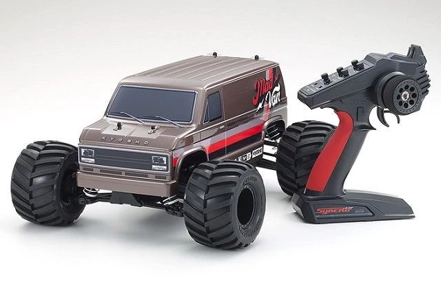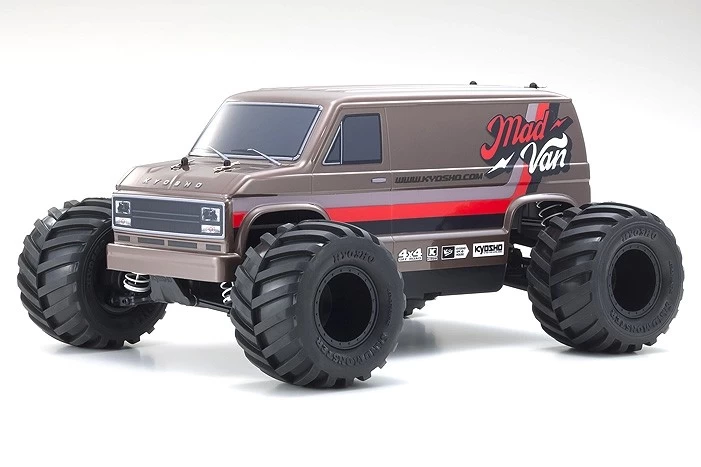 Designed in the image of an American full-size van, Kyosho’s fun MAD VAN model combines retro body styling with a light and sporty chassis for pure R/C enjoyment. The simple design of the FZ02L-BT chassis uses fewer parts for easy maintenance and delivers strength and rigidity through front & rear stiffeners with reinforced ribbing and optimized material formulation on critical parts. In addition, the near symmetrical design and optimal front-rear suspension balance works in combination with the power source to produce excellent control and maneuverability for this type of model. Front and rear differentials, oil shocks and full ball bearing specifications provide performance to compliment its high durability and impact-resistance. Soft compound, wide large-diameter tires with inner foam feature rounded shoulders to produce secure grip, not only off-road, but on sealed surfaces too, so this van can be enjoyed just about anywhere! As the MAD VAN is fully pre-assembled Readyset, only 4 x AA batteries for the transmitter, a battery for the chassis, and a battery charger are required for the fun to begin. Whether going off-road or on-road, the MAD VAN produces dynamic performance to be enjoyed with its own unique style.