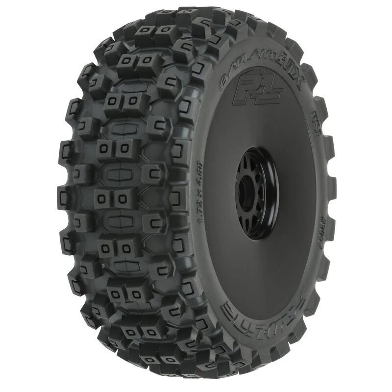 This is a pair of Pre-Mounted Badlands MX Tires for1:8 Buggy. Pro-Line is taking the 1:8 Buggy tire game to the next level with the Biggest and Baddest tire ever conceived: the Pre-Mounted Badlands MX! Pro-Line Badlands tires are known for having sweet Motocross inspired tread and the all-new Badlands MX tires kick that up a notch with a Bigger and Bolder knobby tread that matches modern MX;tire design. The Badlands MX is a true All-Terrain tire that will find traction on any surface but is best suited for loose & loamy dirt, mud or grass. Just imagine your buggy throwing up huge rooster tails with these awesome looking tires!