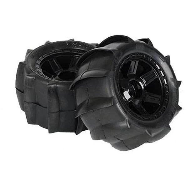 This is a pair of Sling Shot 3.8″ (Traxxas® Style Bead) Sand or Snow Truck Tires Mounted on Desperado Black 1/2″ Offset 17mm Wheels for MT Front or Rear. The newest form of fun is here with the release of the all-new Sling Shot 3.8″ paddle tire for monster trucks and truggies. The Sling Shot provides hours of fun in the sand, snow or even in the occasional mud pit. Now that it comes pre-mounted on Desperado 3.8″ (Traxxas® Style Bead) Wheels you have even more reason to go tear up the sand or snow!