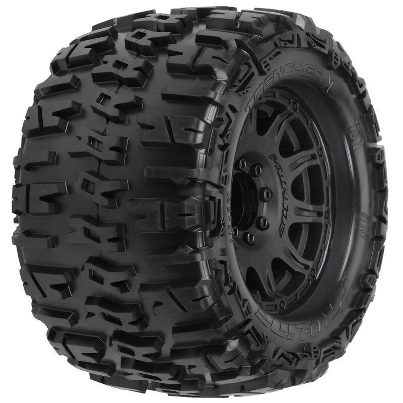 The Trencher X 3.8″ tires come Pre-Mounted on the next generation 3.8″ wheel design from Pro-Line, the Raid 3.8″ Removable Hex Wheel! Imagine being able to replace a damaged wheel hex without needing to replace your glued tires! These new Raid 3.8″ wheels make this possible by using a unique 8×32 interlocking hex design that is secured to the wheel by 8 M3 screws that are spaced 32mm across. The hexes are included and are also available separately (6345-00). The built-in adjustability and ease of use make this a new must-have wheel for bashers everywhere! Be the first to own the latest and greatest technology from Pro-Line, get the new pre-mounted Trencher X tires now!