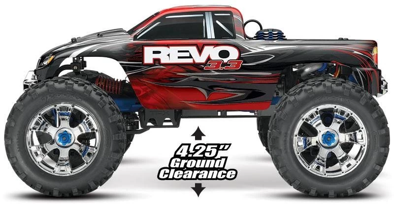 Monster innovation, monster versatility, and supreme size come together in the one truck that could only come from Traxxas. The Revo 3.3 defines what it means to be the pinnacle of monster truck performance, the standard bearer for cutting edge innovation and boundless capability that all others are measured against. The Revo 3.3 is pure monster to its core with its massive presence, meaner gaze, and feature-rich capability. More importantly, Revo’s advanced engineering equips it for fun, and the Revo 3.3 delivers even more of it!
