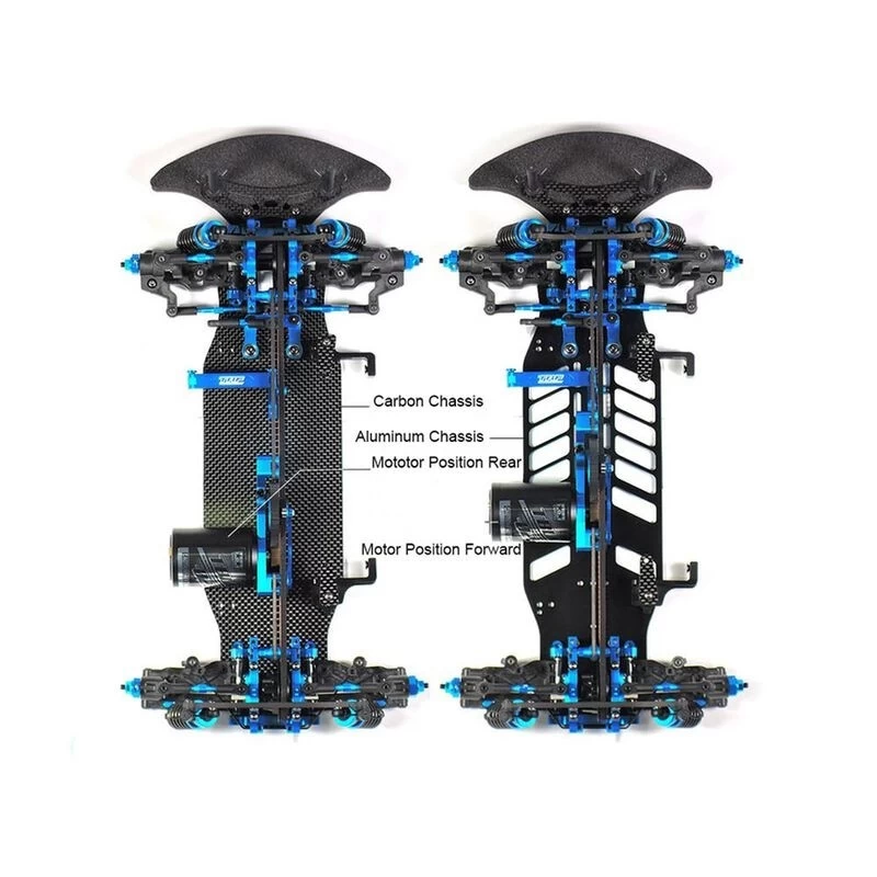 - Dedicated chassis parts are used – 2mm thickness dual bridge type vertical frame, and a choice of carbon fiber or aluminum lower decks. Different combinations of upper deck part (4 total are included) are used for the different motor positions.
