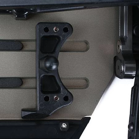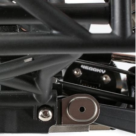 The motor and center diff can be mounted at an angle or in line with the chassis, allowing adjustment of the power bleed between the front and rear drivetrain. Mounted at an angle, the power bleeds evenly front-to-rear and the truck will drive out of the turns harder from point to point. Mounted in line, more power bleeds to the rear, giving the truck more aggressive on-power steering.
