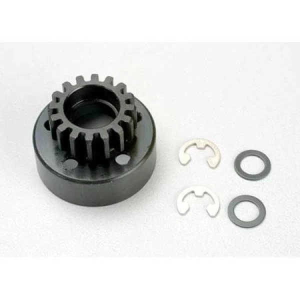 Clutch bell (16-tooth)/5x8x0.5mm fiber washer (2)/ 5mm e-clip (requires 5x11x4mm ball bearings part TRA4611) (1.0 metric pitch)